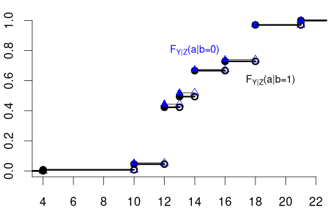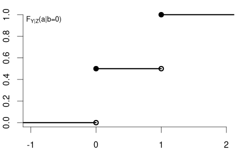 The conditional PMFs \pi_{Y|Z=0}(a) = P(Y = a | Z=0) and \pi_{Y|Z=1}(a)= P(Y = a | Z=1) indicate the jump heights of F_{Y|Z=0}(a) and F_{Y|Z=1}(a) at a.