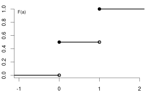 Consider the coin toss binary random variable Y = \begin{cases} 1 & \text{if outcome is heads,} \\ 0 & \text{if outcome is tails.} \end{cases} The CDF for a fair coin is F_Y(a) = \begin{cases} 0 & a < 0, \\ 0.5 & 0 \leq a < 1, \\ 1 & a \geq 1, \end{cases}