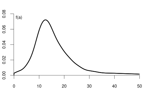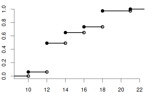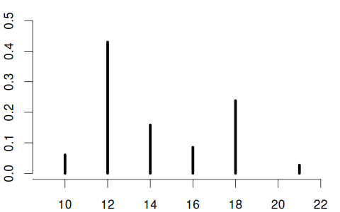 Here, the PMF is \pi_Y(a) = \begin{cases} 0.06 & \text{if } a = 10 \\ 0.43 & \text{if } a = 12 \\ 0.16 & \text{if } a = 14 \\ 0.08 & \text{if } a = 16 \\ 0.24 & \text{if } a = 18 \\ 0.03 & \text{if } a = 21 \\ 0 & \text{otherwise} \end{cases}