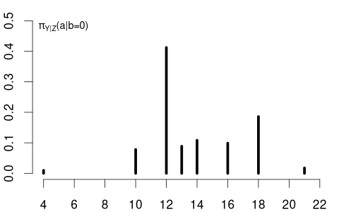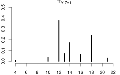 Clearly, education and married are dependent random variables. For example, \pi_{Y|Z=0}(12) > \pi_{Y|Z=1}(12) and \pi_{Y|Z=0}(18) < \pi_{Y|Z=1}(18).