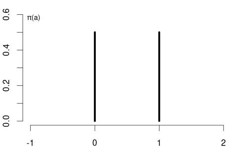 The PMF of the coin variable is \pi_Y(a) = P(Y=a) = \begin{cases} 0.5 & \text{if} \ a \in\{0,1\}, \\ 0 & \text{otherwise}. \end{cases}