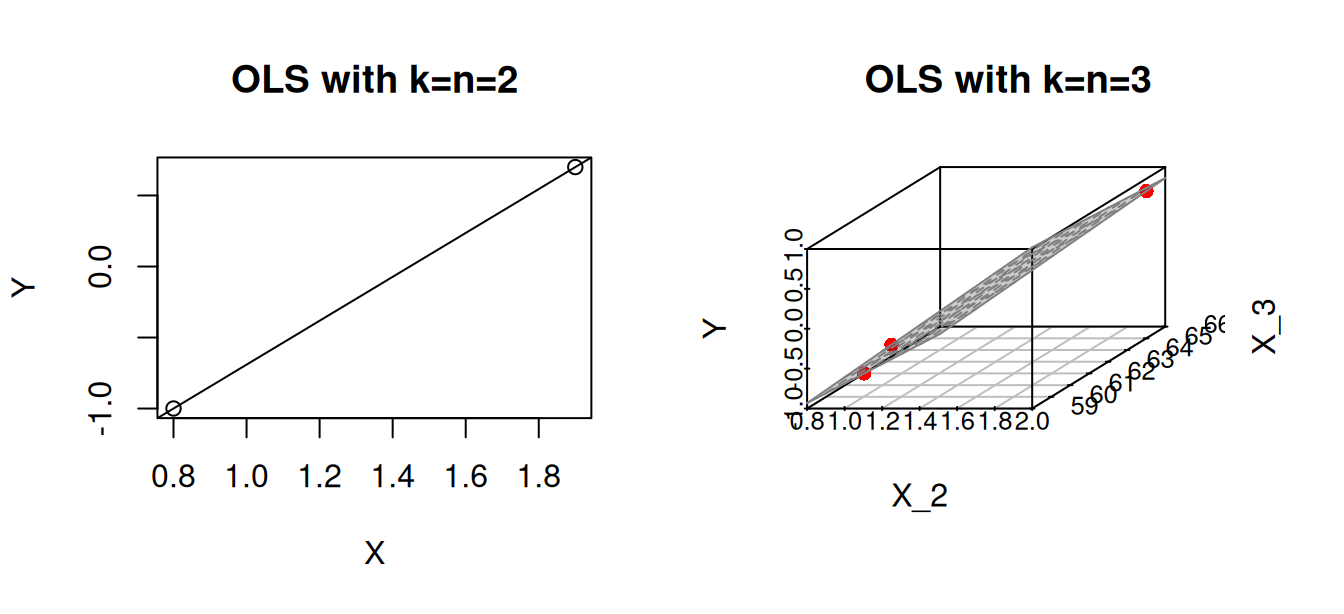 If k=n \geq 4, we can no longer visualize the OLS regression line in the 3D space, but the problem of a perfect fit is still present. If k > n, there exists no unique OLS solution because \boldsymbol X' \boldsymbol X is not invertible. Regression problems with k \approx n or k>n are called high-dimensional regressions.