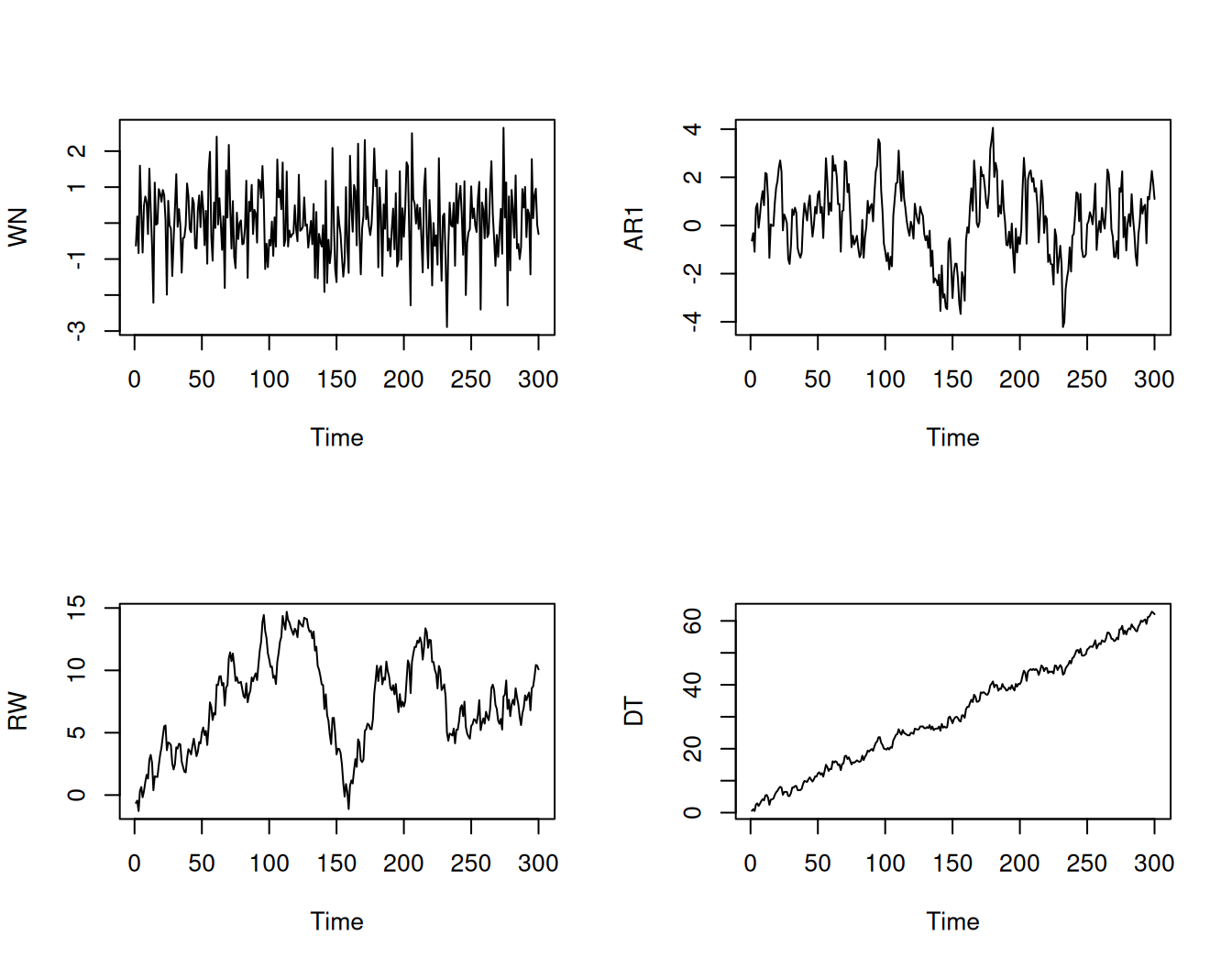 The sample paths of simulated white noise, AR(1), random walk and deterministic trend time series are shown below. The series shown at the top are stationary while the series at the bottom are nonstationary.