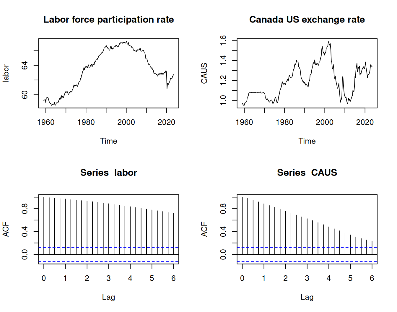 We expect no relationship between the US labor force participation rate and the Canada US exchange rate. However, the sample correlation coefficient is extremely high: