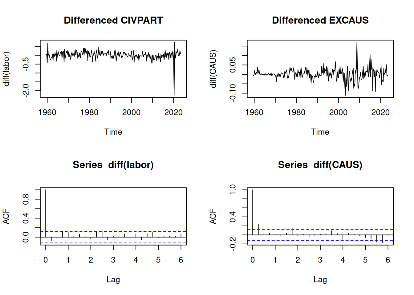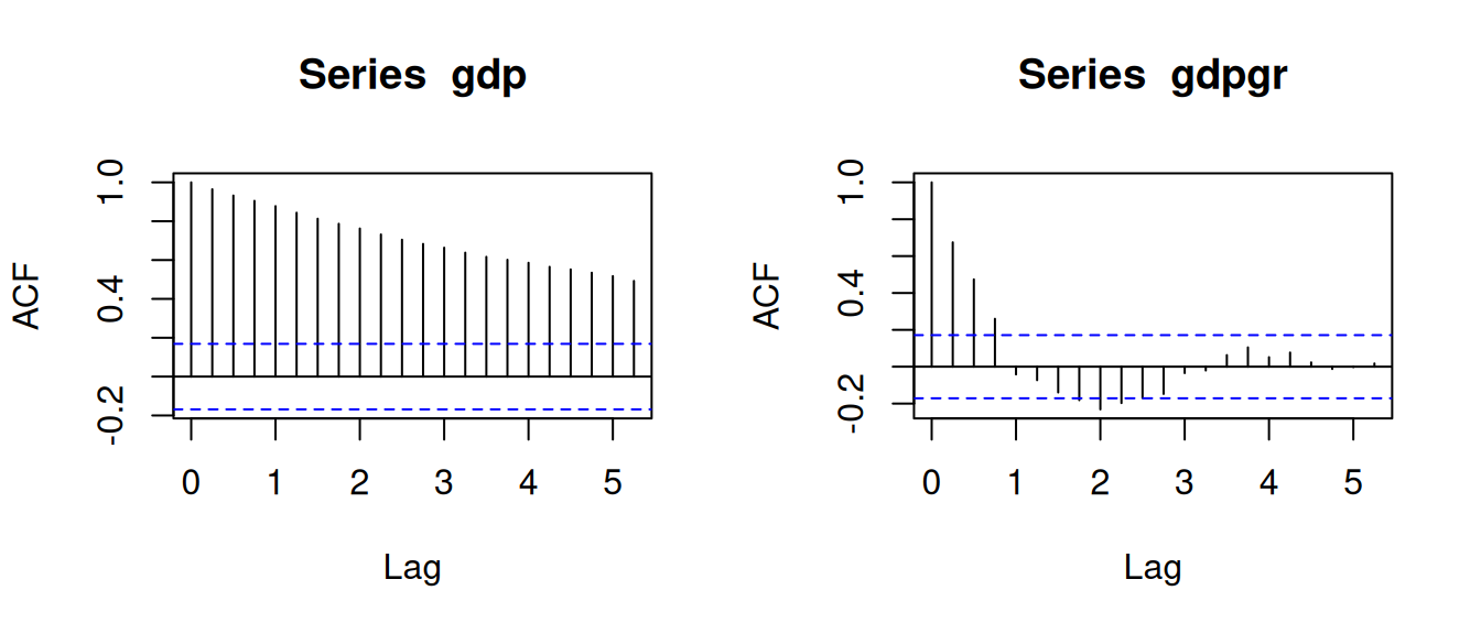 This matches our earlier graphical evidence: GDP in levels appears nonstationary, while GDP growth behaves like a stationary series.