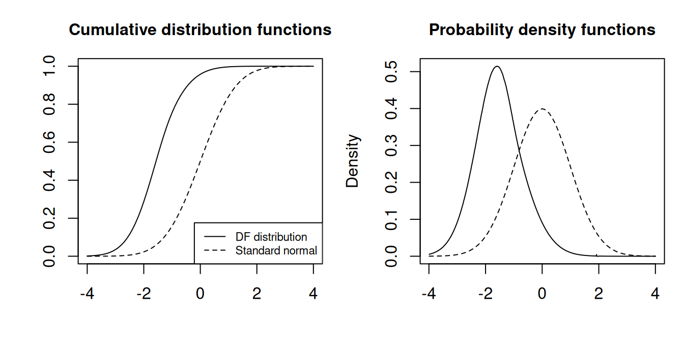 The t-statistic Z_{\widehat \psi} from Equation 9.3 converges under H_0 to the Dickey-Fuller distribution as well. Therefore, we can reject the null hypothesis of nonstationarity, if Z_{\widehat \psi} is smaller than the corresponding quantile from the DF distribution.