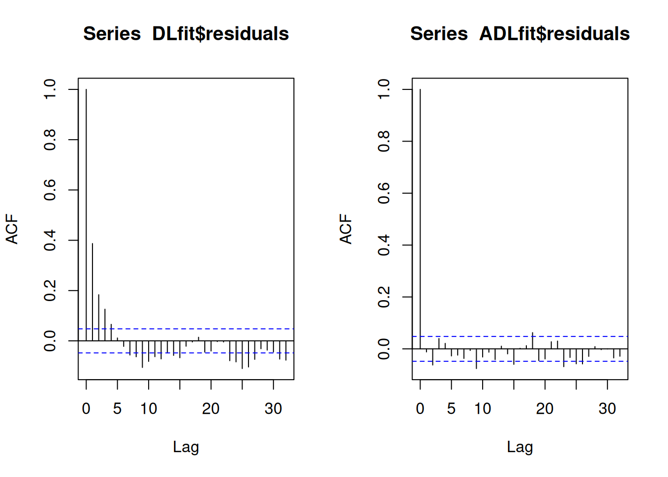 Thus, using HC1 standard errors seems reasonable for the ADL model. For the DL model, HAC (heteroskedasticity and autocorrelation consistent) standard errors should be used instead.
