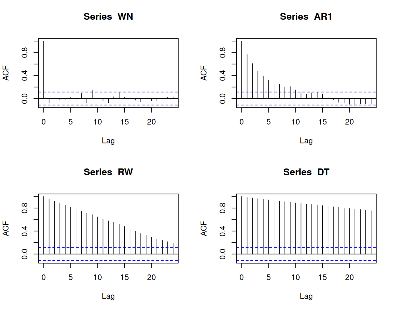 For many stationary time series encountered in practice, the ACF decays to zero quite quickly as \tau increases. The ACFs shown at the top are from stationary time series while the ACFs at the bottom are from nonstationary time series.