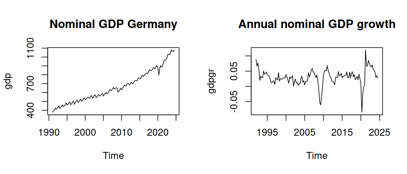 Consider the quarterly nominal GDP of Germany and its annual growth rate: