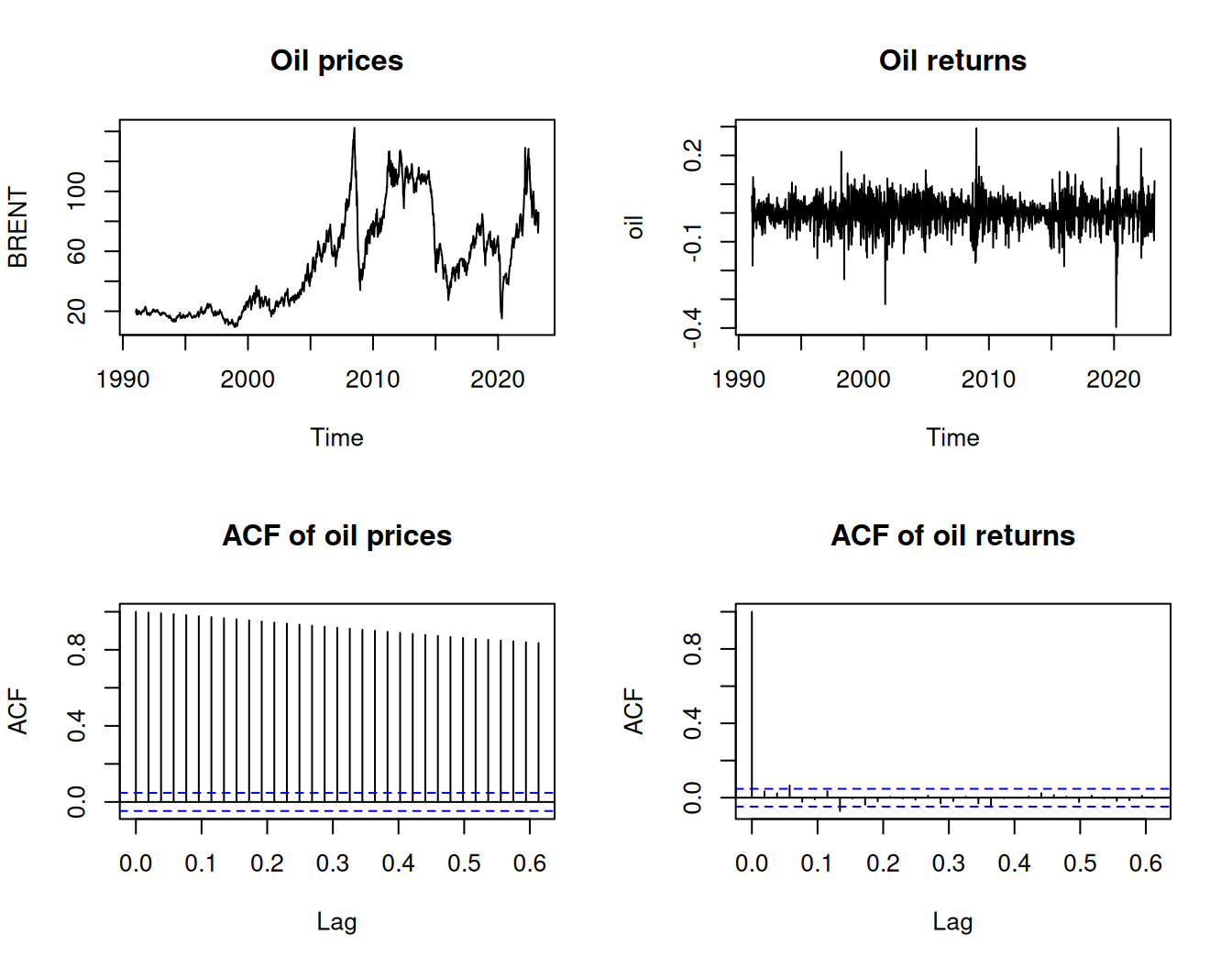 Similarly, the oil price shows nonstationary behavior, while the oil returns (first differences of log-prices) appear stationary: