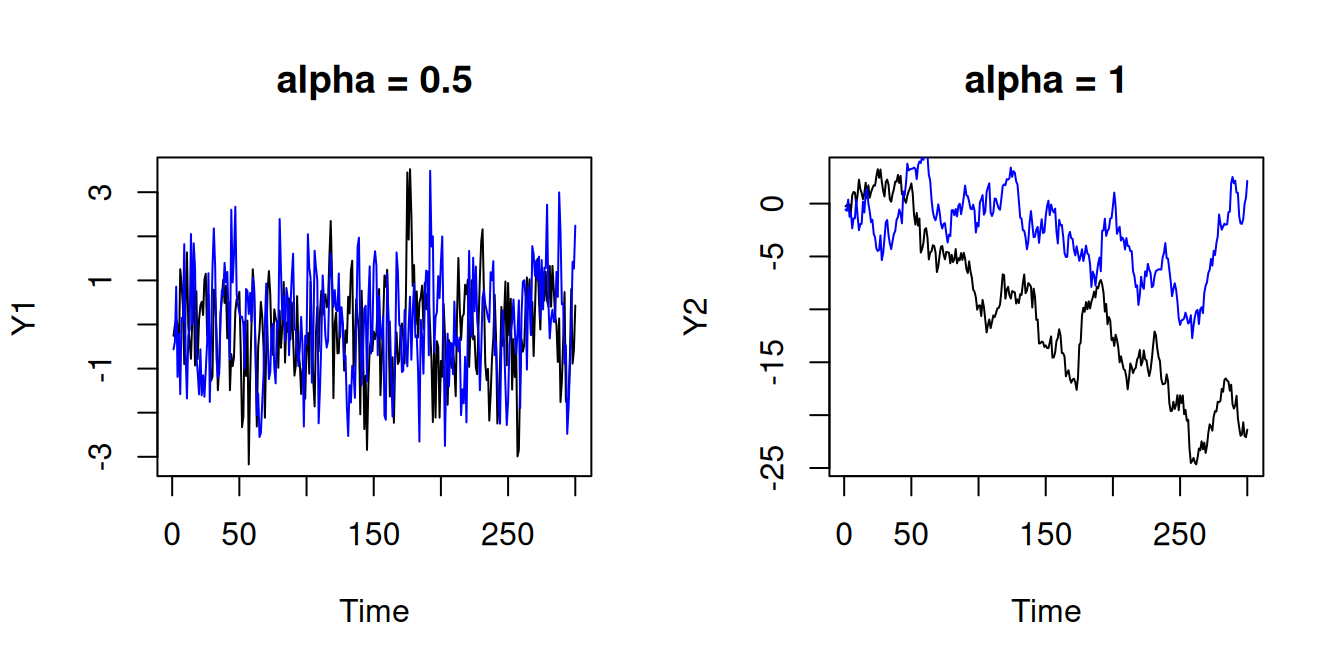 Let’s simulate two independent AR(1) processes: Y_t = \alpha Y_{t-1} + u_t, \quad X_t = \alpha X_{t-1} + v_t, for t=1, \ldots, 300, where u_t and v_t are i.i.d. standard normal. If \alpha = 0.5, the processes are stationary. If \alpha = 1, the processes are nonstationary (random walk).